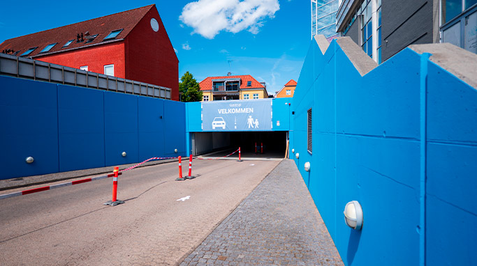 Bemærk: På grund af ombygning er den direkte tunnel fra stationen midlertidigt lukket. Du skal i stedet gå over lyskrydset og benytte parkeringskælderens tunnel, hvor vi har lavet en sikker adgang for gående.