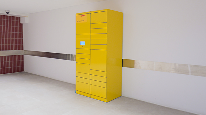 Skal du sende en pakke, køber du blot en pakkelabel online og afleverer pakken i boksen – så sørger DHL for resten.